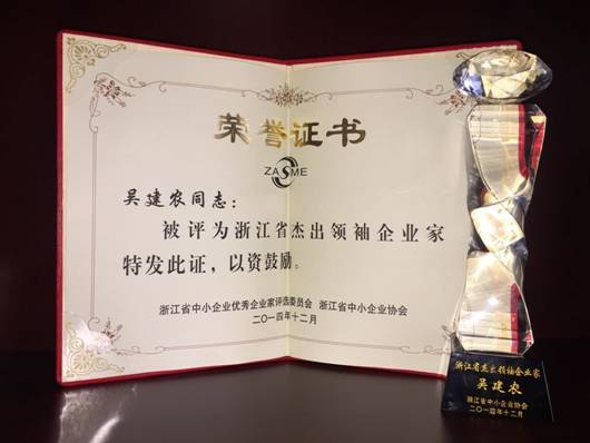 集团总裁吴建农先生凭借优秀的商场履历和骄人的业绩,从全省千余名参选的企业家中脱颖而出,荣获“浙江省杰出领袖企业家”称号。