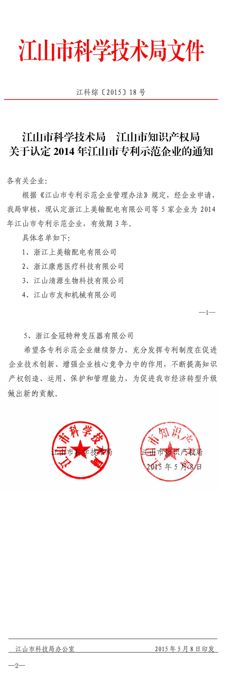同景集团友和机械被认定为江山市专利示范企业