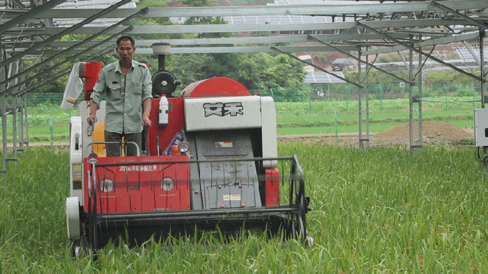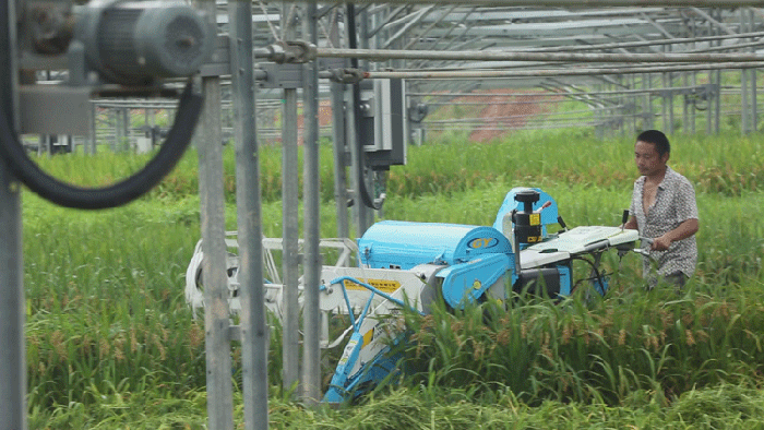 该常山同景农光互补智能光伏电站项目,于今年3月开工建设,一期规模10.9MWP于5月并网发电。在光伏板下的水稻从种植到收割全部采用机械化作业,从目前98.4亩的水稻生长情况来看,预计亩产量能够突破700斤。
