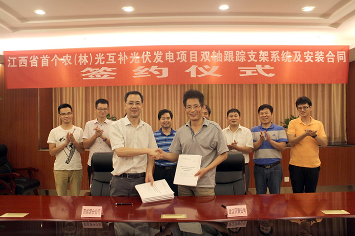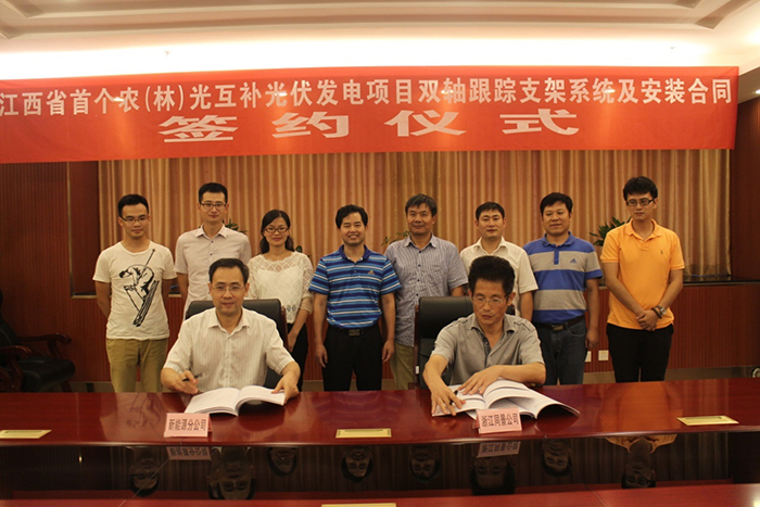 自2014年始,经过对同景集团农光互补智能光伏电站持续一年多的考察、调研,中电投集团相关领导和专家对同景农光互补的光伏双轴跟踪技术表示赞许和认可。经过多轮激烈的投标角逐,凭借农光互补的电站模式,光伏双轴联动的技术优势,同景从多家竞标者中脱颖而出,最终成功中标。合同中约定,同景集团将满足中电投江西电力有限公司新能源分公司江西乐平鸬鹚70MWp光伏电站项目所需的双轴跟踪支架系统,并提供电站项目相关的安装工作。