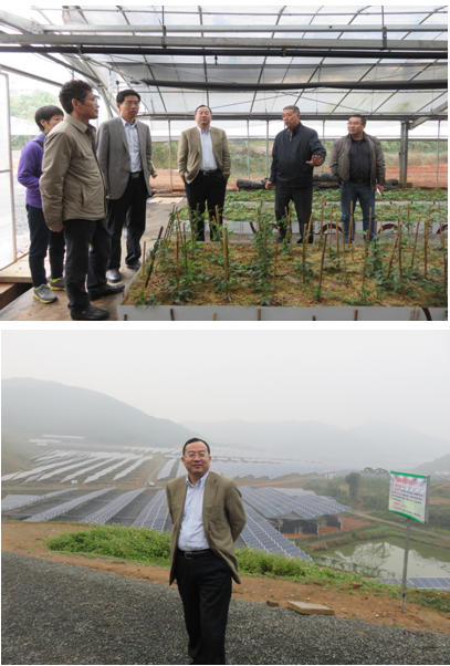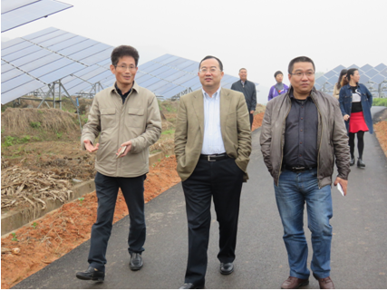 2015年11月5日下午,国家发改委宏观经济研究院副院长研究员吴晓华、宏观院科研管理部主任研究员高国力、科研管理部副主任副研究员罗蓉一行在江山市发改局副局长姜孝荣、集团总裁吴建农的陪同下,参观了同景新能源集团江山凤林30MWp大型农林光互补光伏电站。