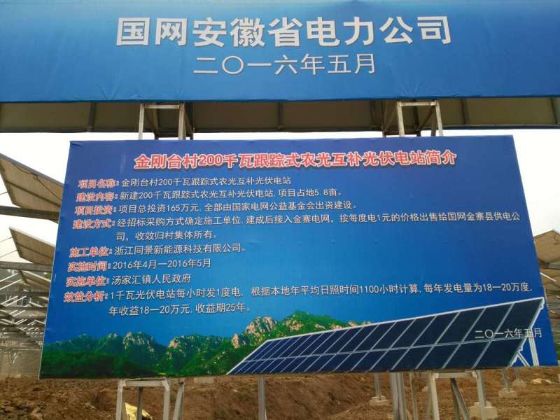 2016年6月21日,同景新能源集团承建的国家电网金寨县汤家汇镇金刚台村200KW追踪式农光互补光伏扶贫项目正式通过项目验收。