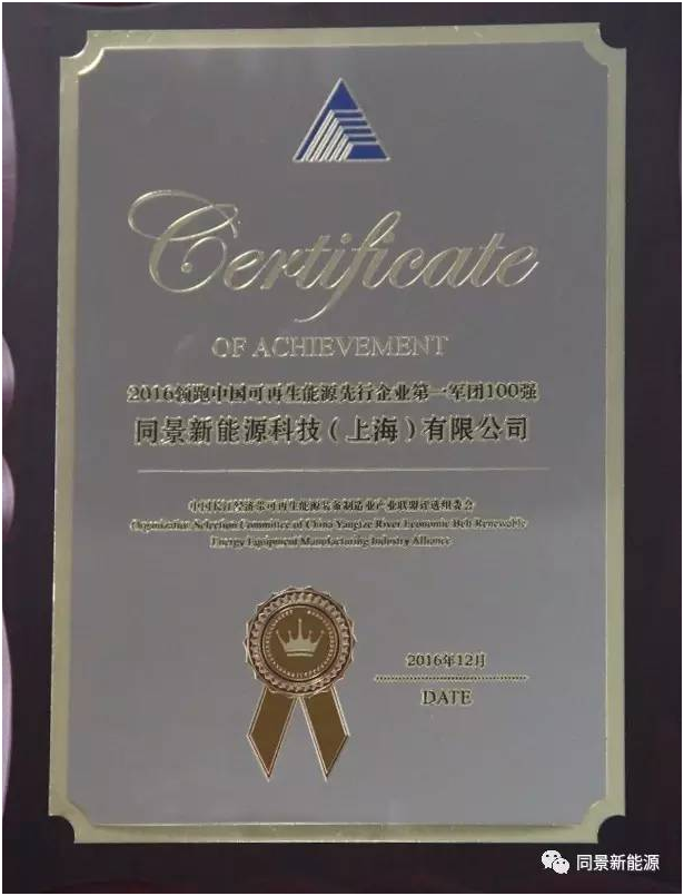 同景新能源荣获“2016领跑中国可再生能源先行企业 第一军团100强”称号