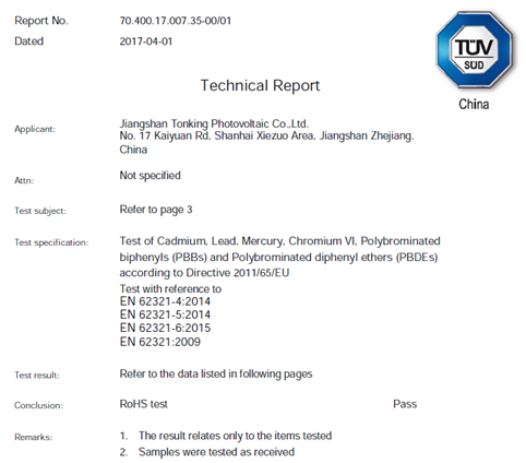 2017年4月1日,同景新能源集团(以下简称“同景”)产品成功通过全球权威的第三方检测认证机构TÜV南德意志集团(以下简称“TÜV SÜD”)的RoHS认证。作为一家技术导向型的企业,同景始终坚持追求光能的技术研发和光能的多元化利用。RoHS认证的通过意味着由同景自主研发的环保型浮筒的设计、结构、材料符合现有行业工艺标准,为同景浮筒的产品性能及环保属性带来可靠保障。