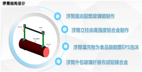同景自主研发的漂浮式铝合金跟踪支架系统采用了独特的食品级环保浮筒设计。独立的浮筒基础,浮筒盖由阻燃玻璃钢制作,立柱由高强度铝合金制作,浮体为食品级阻燃EPS泡沫外包玻璃纤维布、聚氨酯或镁铝合金的浮体结构。该结构性能可靠、寿命长(可达30年以上),浮体占用水面4.5%面积,无污染、不破坏“蓄水层”,不影响鱼类的生长,达到渔业养殖和发电有序结合的模式,从而实现了一地两用,提高了水域的利用效率和单位面积水域的产值。