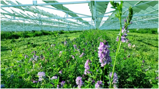 宝丰二期项目采用同景自主研发的斜单轴跟踪支架系统。支架结构让组件排布受风面积小,提高了支架系统的整体抗风能力,完全适应西北地区风沙大的气候和环境特性。同时,架空距地面2米以上,每排立柱间距达8米,确保农作物生长所需光照,并为大型农机作业提供充裕的空间。整体跟踪支架的结构设计便于日常维护、大大降低了建设成本。