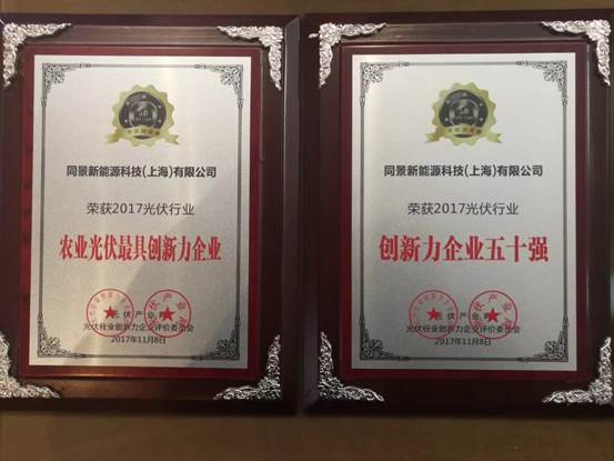 大会当晚还举行了盛大的颁奖典礼,「PV TOP 50」用专业、权威的价值视野,倡导创新进取,寻找本年度的“最具创新”标杆企业。同景新能源通过不断技术创新,先后申请自主专利70余项,获授权50余项,国际专利3项。依托自主专利技术,同景新能源竣工及在建光伏电站已超1.5GWp,跟踪支架应用量居全国第一。同景新能源一直专注于太阳能发电和光热综合利用,依托自主专利技术广泛采用“上部光伏发电、下部农业种植”相结合的农光互补光伏“生态一体化”开发模式,成功打造了多个智能光伏生态综合体项目,真正实现了农光互补,在太阳能领域一支独秀。在此次评选中同景新能源凭借以上自身优势在经过申报——初审及公示——网上投票等环节与近200家光伏企业经过为期4个月的激烈角逐,最终斩获了“2017光伏行业创新力企业五十强”及“2017农业光伏最具创新力企业”两项殊荣,载誉而归。
