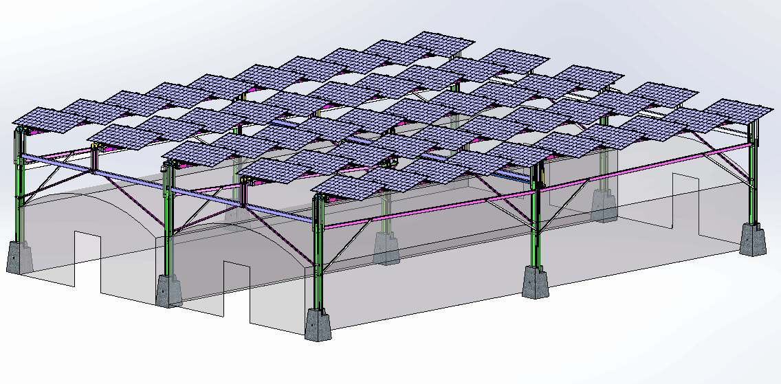 类别 同景农业大棚 单套跟踪系统重量(kg) ≧260 平单轴跟踪系统型号 平单轴(灌注桩) 单套平单轴跟踪系统安装的最大太阳电池组件数 12/15 平单轴跟踪系统尺寸结构 (mm) 5700X6800X高度定制