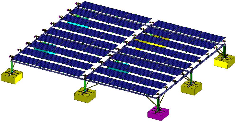 跟踪支架类型 平单轴(独立浮筒式) 适用组件类型 60Ps的多晶硅、单晶硅、双玻 东西向跟踪角度范围 ±30° 跟踪精度 ±3° 单套支架安装的最大光伏组件数量 12 单套跟踪系统尺寸结构(mm) 5450X5200X高度定制 单套容量(KW/套) 3.12-3.36 每MW套数(套/MW) 298~320 占地面积 15~16亩/MW 透光率 30%左右 执行机构参数 推杆 执行机构供电形式 自供电/网供 执行机构输入电压范围(V) 380/480 系统功耗 0.30% 工作风速 17m/s 抗风载能力 30m/s 材质 碳钢热浸锌 工作环境温度(℃) -40~50 使用寿命(年) ≥25 跟踪模式 GPS 控制硬件 西门子PLC 数据传输 以太网
